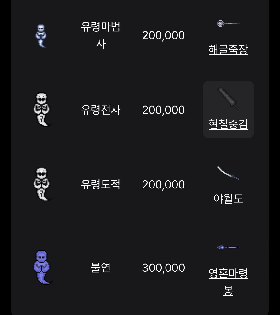 유령굴 가서 철검, 해골죽장, 영혼마령봉, 야월도,
